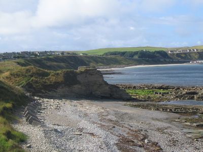 The castle location offers views of Thurso Bay and contains visible structural elements including exposed paving stones and portions of domestic buildings.