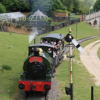 The railway stretches over one mile through the estate grounds, featuring historic railway buildings, architectural elements, and transport memorabilia from various British locations.