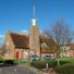The Roman Catholic Church of St Teresa of Lisieux features red brick construction, steep tiled roofs, and a flèche resembling a radio mast.