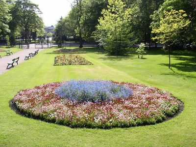 Queens Park spans 28 acres of landscaped grounds with ornamental flower beds, urban trees, sculptures, and sports facilities in the northeast section of Burnley.