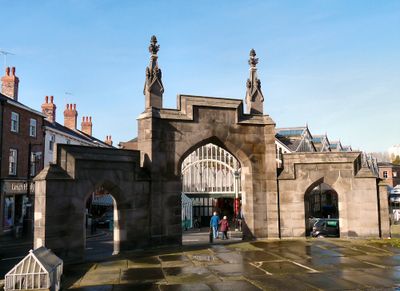 Gateway to Parish Church of St Mary and fountain to side, Grade II* listed gateway in Stockport, Greater Manchester, UK