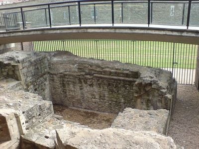 Visitors can examine the excavated foundations of the southern tower within the Tower Hill pedestrian underpass, connecting the Tower of London to Tower Hill station.