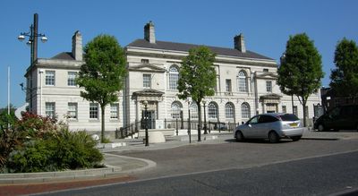The Town Hall stands at The Crofts off Moorgate Street, featuring fifteen bays with a central section containing round-headed windows and Doric columns.