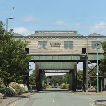 Egerton Bridge, rolling-lift bascule bridge at Egerton Dock, Birkenhead Docks, Wirral, Merseyside, UK