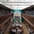 The three-level Edwardian building features oak galleries, viridian-green walls, and a glass-ceiling conservatory filled with numerous bookshelves containing international literature.