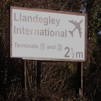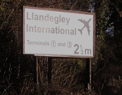 Llandegley International Airport, Fictional airport signpost on A44 road in Powys, Wales.
