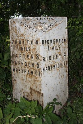 Milepost, opp. Bickerton Church, on cross roads
