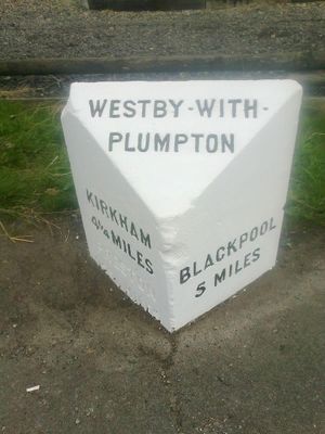 Milestone, Peel Hill Bridge, by Maple Farm Nursery, milestone in Westby With Plumptons, Fylde, UK