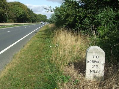 Milestone, Brettenham, Half mile E of large parking layby, milestone in Kilverstone, Breckland, UK