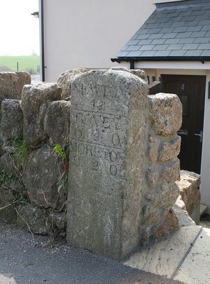 Milestone, Station Road, by No. 4, The Sidings, opp Bowring Mead, milestone in Moretonhampstead, Teignbridge, UK