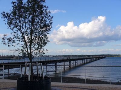 The 2,100-foot pier extends across Southampton Water, featuring a wooden boardwalk and steel support structures that connect Hythe with Southampton.