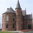 The red brick municipal building features a three-story turret, curved walls, and multiple window styles forming an asymmetrical main frontage on Mark Street.