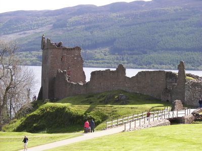 The bridge position offers the first glimpse of the castle's remaining walls against the backdrop of Loch Ness's northern waters.