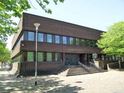 The Portsmouth Courts of Justice stands as a modern rectangular structure with glass facades and concrete elements near the city center of Portsmouth.