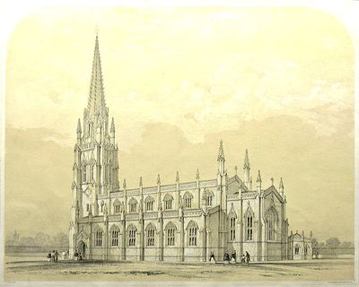 The church building featured Gothic Revival architecture with a prominent tower and spire at the intersection of Bishop's Road and Westbourne Terrace.