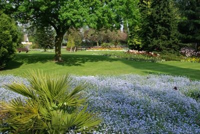 The park includes formal gardens, an outdoor gym, disc golf areas, walking paths, cricket fields, football grounds, and a children's play area with water features.