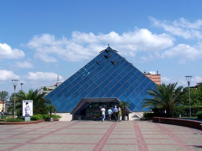 A central glass pyramid structure channels natural light through all retail floors of the shopping center, marking the building in the urban landscape.