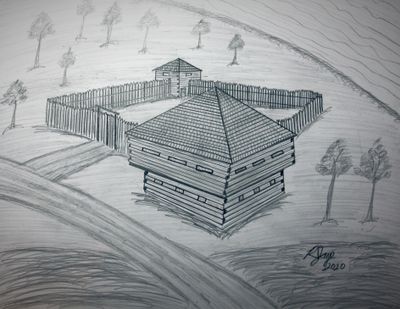 Fort Basinger stands on the south bank of the Kissimmee River, featuring a log palisade structure with blockhouses at opposing angles.