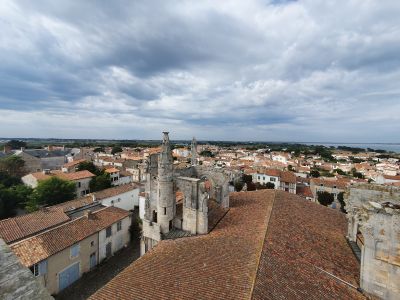 The observation bell tower rises above Saint-Martin-de-Ré, providing views of red-tiled roofs, fortifications, neighboring islands, and Fort Boyard in clear weather.