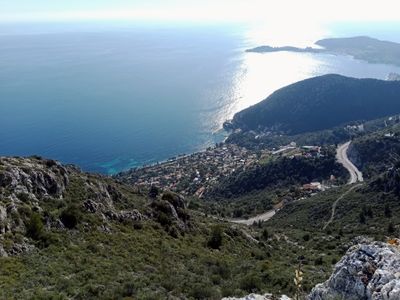 During clear weather, the summit view extends to Corsica and encompasses Saint-Jean-Cap-Ferrat, Èze Bay, and the Nice peninsula.