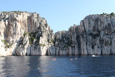 The calanque presents two vertical cliffs extending from Eissadon to Castelvieil plateau, forming a narrow inlet into the Mediterranean Sea.