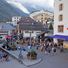The pedestrian zone connects directly to the main bus station and provides access to multiple sports equipment rental locations for mountain activities.