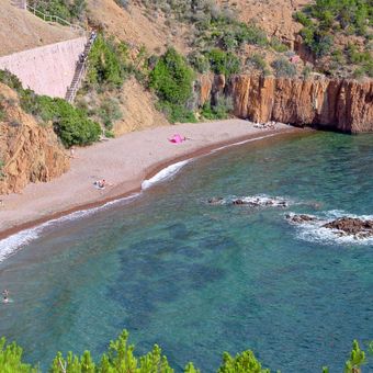 The Maubois cove features clear waters stretching along 150 meters of coastline, framed by the distinctive red cliffs of the Esterel mountains.
