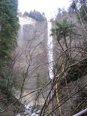 The Grand Moulin river creates a perfect vertical stripe of falling water, which reaches maximum flow during spring when snow melts from La Grande Sure peak.