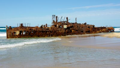 The SS Maheno is a large shipwreck beached on Fraser Island in Queensland, with its hull rising above the sand. The remains show the structure of an ocean liner from the early 1900s, revealing the ship's size and metal framework.