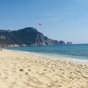 Cleopatra beach is an extensive sandy shore in Alanya with fine golden sand that spreads for several kilometers. The shoreline slopes gently into the water and is framed by steep limestone cliffs that separate the sand from the town above.