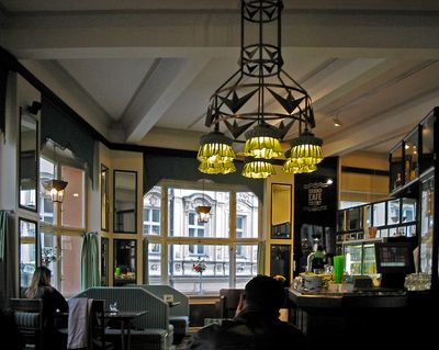 The café displays Czech cubist architecture through its furniture, light fixtures, and decorative elements, representing a significant period in European design history.