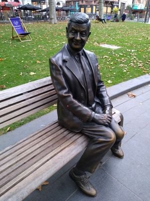 A life-sized bronze figure sits on a bench displaying the typical posture and characteristic facial expression of this famous comedy character wearing a suit and tie.
