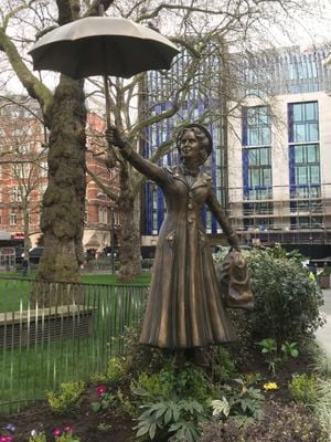 This bronze figure represents the magical nanny from the 1964 film, standing among other cinematic characters in London's entertainment district.