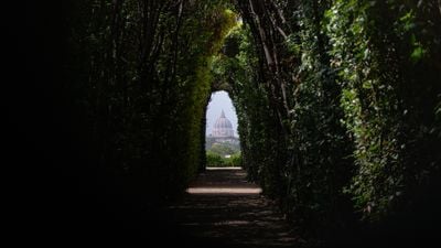 This keyhole sits in a green wooden door at the end of a dead-end street and belongs to the Priory of the Knights of Malta. Through the small opening, visitors see the dome of St. Peter's Basilica framed by a trimmed garden path that runs in a straight line toward the basilica.