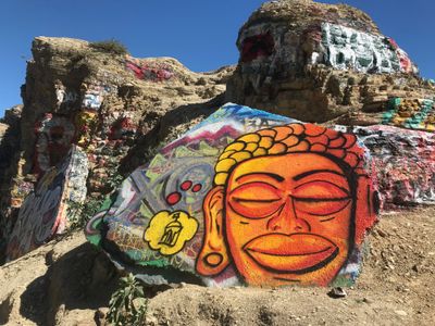 The concrete remnants now serve as an open gallery where artists create murals and graffiti, transforming the abandoned space into an outdoor exhibition.