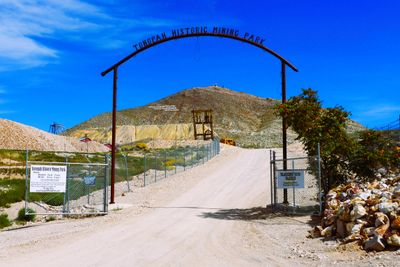 The Tonopah Historic Mining Park spans 113 acres featuring original mining sites, buildings, tunnels, and equipment from the silver mining era.