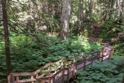 The Giant Cedars Boardwalk Trail features an elevated wooden pathway that winds through ancient western red cedars reaching heights of 50 meters.