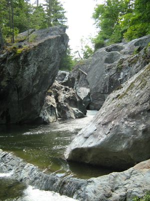 The natural formation includes an 80-foot high rocky passage stretching 1.5 miles along the Huntington River through Vermont's bedrock schist.