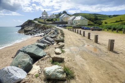 The pebble shore draws walkers who enjoy exploring the varied stones and searching for sea glass along the water's edge. Local fishermen use the beach regularly, and visitors often stop to watch the tidal movements and weather patterns that shape the coastline.