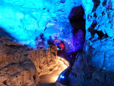The cave system extends through multiple chambers containing natural formations of stalactites and stalagmites created by mineral deposits over thousands of years.