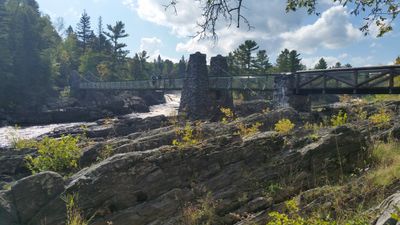 The Swinging Bridge is a suspension bridge made of stone pillars and steel cables that spans the St. Louis River and accommodates pedestrians and cyclists. The structure features a footway suspended between sturdy supports that allow visitors to cross above the water.