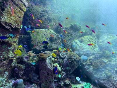 The Lost Chambers houses more than 65,000 marine animals across 20 exhibits, featuring sharks, rays, and tropical fish in large glass-walled tanks.