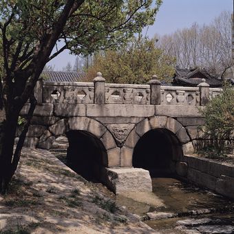The bridge incorporates carved stone goblins beneath its structure, following Korean architectural traditions of using protective symbols against malevolent forces.