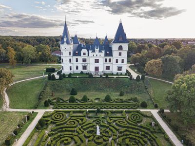 The Boxwood maze is a large recreational area with winding hedge pathways located in Tiszadob near Andrassy Castle. The trails cut through dense greenery and connect different sections throughout the grounds.