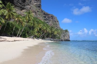 A white sand beach stretches along the coastline at the base of a 90-meter limestone cliff bordered by numerous coconut palms.