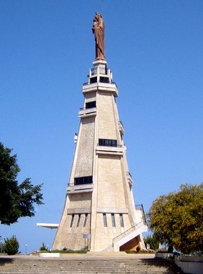 Our Lady of Mantara is a shrine on a hilltop in Maghdouché with a modern tower and a bronze statue of the Virgin and Child positioned next to an ancient sacred cave. The grotto sits beneath the newer structure and forms the spiritual core of this pilgrimage site.