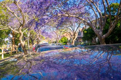 The jacaranda trees were introduced from South America and have established themselves as a defining characteristic of this residential Sydney street.