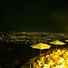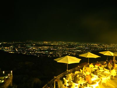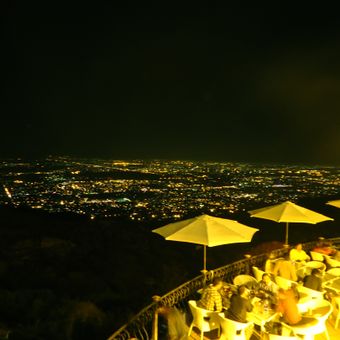The restaurant features an outdoor terrace where guests can dine while watching the sun set behind the mountains and the city lights emerge below.