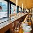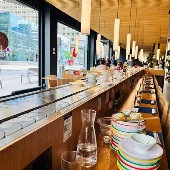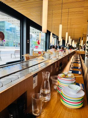 The restaurant features a rotating counter system where plates of sushi, sashimi, and other Japanese specialties circulate continuously past dining guests.