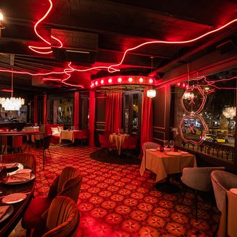 Belbo dos besos is an Italian restaurant and bar spread across two floors with modern decor throughout the space. The ground level displays the working kitchen, while upstairs offers a separate dining room with contemporary furnishings.